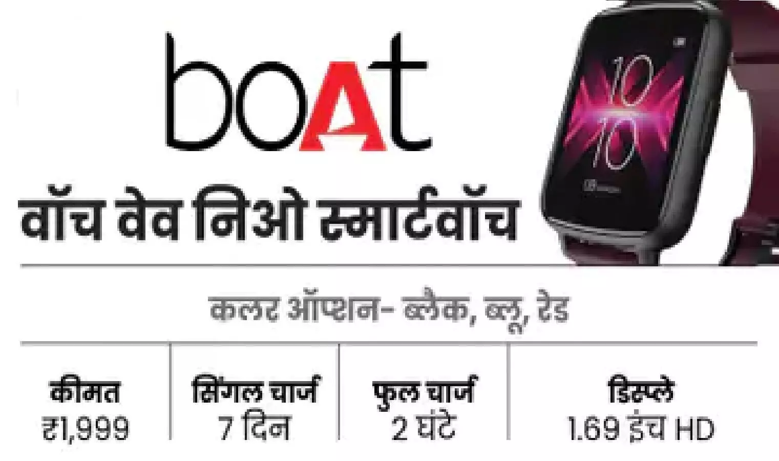 इस घडी की कीमत 2,999 रुपए है, लेकिन ऑनलाइन आप इसे 1,999 में खरीद सकते हैं. Boat Watch Wave Neo Smartwatch की बैटरी लाइफ 7 दिन की है, और यह वाटरप्रूफ है. जिसमे 100 से ज़्यदा बैकग्राउंड ऑप्शन और 10 एक्टिविटी मोड्स मिलते हैं. घडी को चार्ज करने में 2 घंटे का समय लगता है. (Best Smartwatch Under 2000)