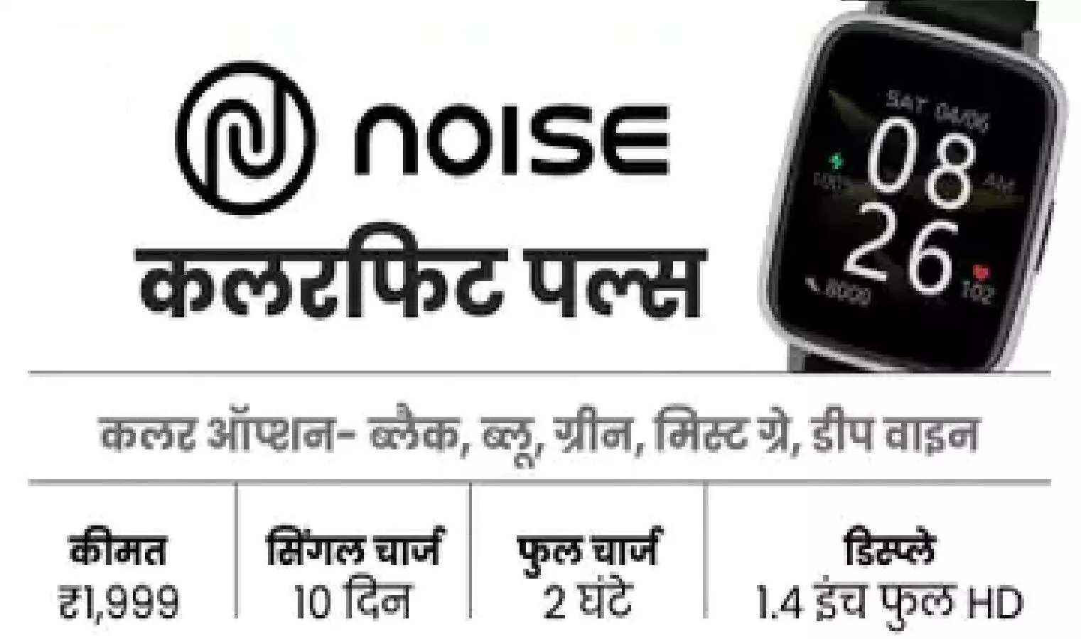 Noise Colorfit Plus की कीमत भी 1,999 रुपए है, जिसमे 24/7 हार्ट रेट मॉनिटरिंग, 1.4 इंच का फुल टच डिस्पे, IP68 रेटिंग वाला वाटरप्रूफ सर्टिफिकेट और 10 दिन का बैटरी बैकअप मिलता है. (Best Smartwatch Under 2000)