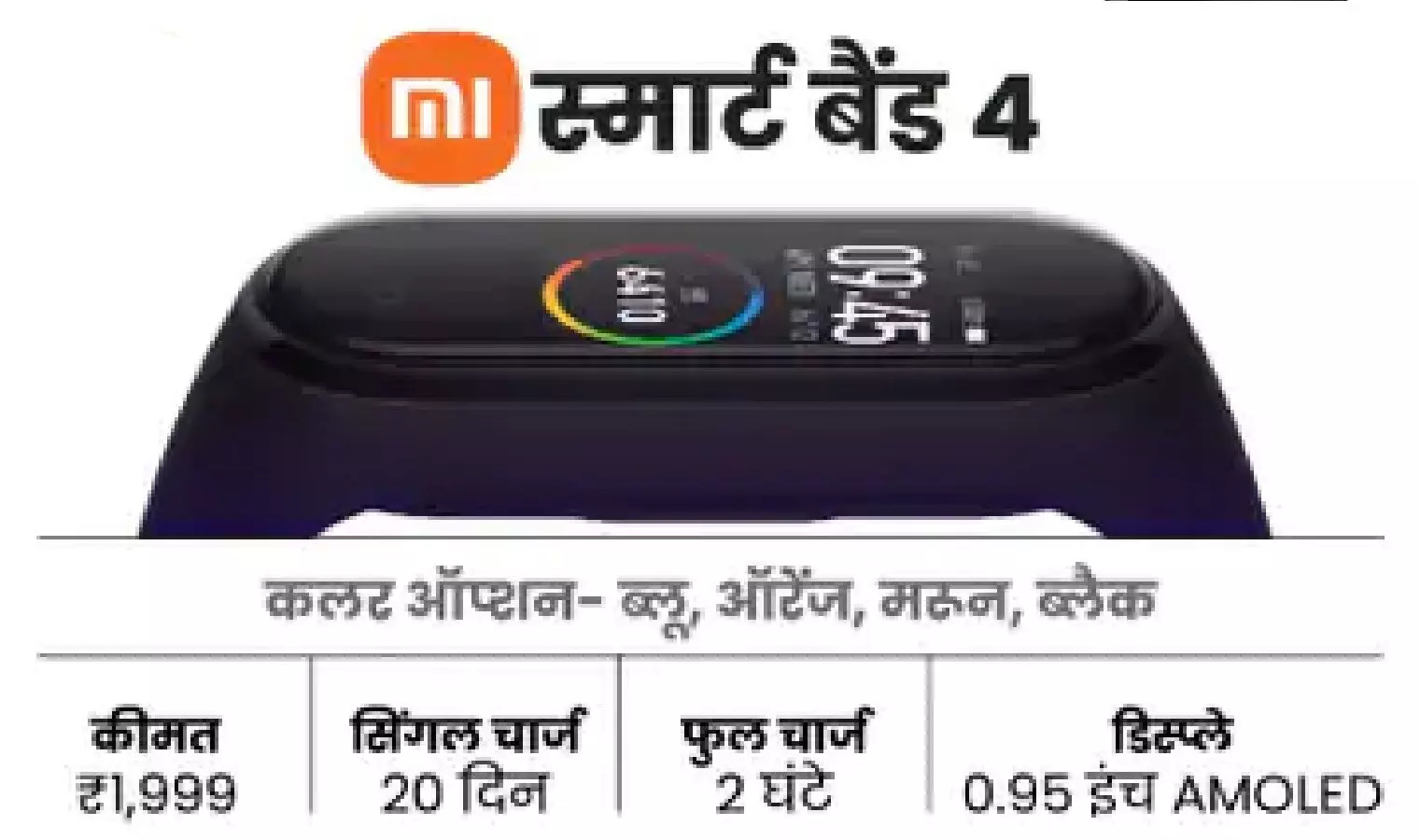 MI Smartband 4 एक बढ़िया अफोर्डबल स्मार्टवॉच है, जिसकी कीमत सिर्फ 1,999 रुपए है. ये वाटरप्रूफ तो है ही साथ ही इसका बैटरी बैकअप 20 दिन का है. दिन-रात आपका हार्ट रेट मॉनिटर करती है, इसमें स्ट्रॉक रेकग्निशन, स्विम ट्रैकिंग, डेली एक्टिविटी ट्रैकिंग भी होगी। म्यूजिक, वॉल्यूम कंट्रोल, कॉल नोटिफिकेशन, अलार्म, स्लीप मॉनिटर, फोन अनलॉक और डिफरेंट बैकग्राउंड ऑप्शन तो मिलेगा ही. (Best Smartwatch Under 2000)